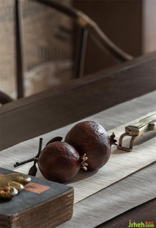 茶室同樣以室內(nèi)景觀化的手法,讓空間心生溫暖。傳統(tǒng)文化元素提取的飾品及古典青銅器皿,古今互見,來自大自然中質(zhì)樸而原始的材料,將古時文士喜愛的雅興閑物納入空間當(dāng)中,與現(xiàn)代的空間共生,那一刻空間又重燃生命張力。兩者結(jié)合似又找到了搬運大自然、重獲生機的美好。