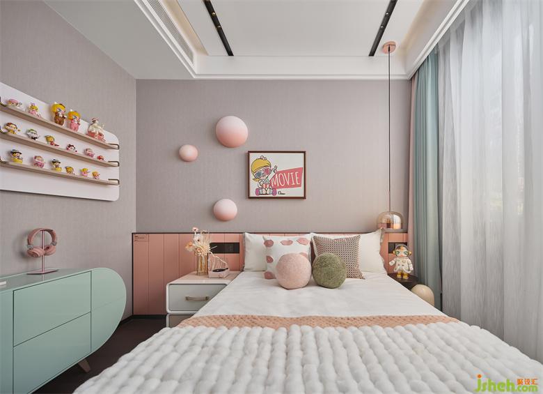 女孩的臥室采用淺粉色為主調,墻壁的油漆肌理隱約展露出揮揮灑灑的設計手法。以此凸顯孩童純真的個性與美好向往。