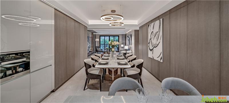 起居室、餐廳、廚房一體化設(shè)計,弱化功能區(qū)域的界限,增強(qiáng)室內(nèi)空間的通透感,提升空間的尺度感。一體化的設(shè)計強(qiáng)調(diào)空間的連續(xù)性,空間相通,形成一個較大的視覺縱深,空間層次更豐富,具有更強(qiáng)的流動性。