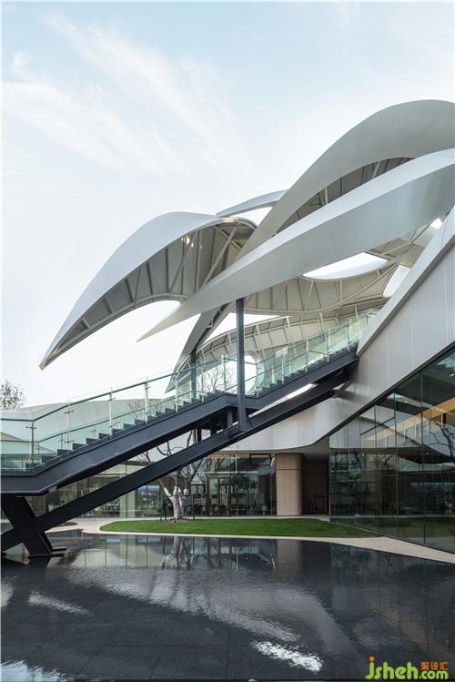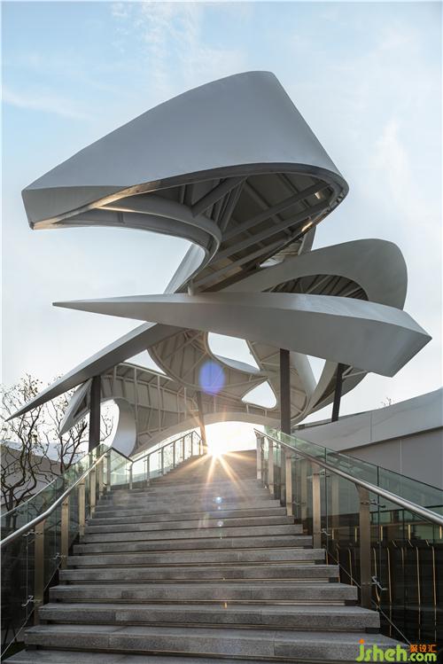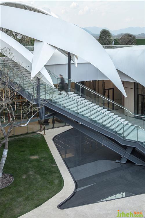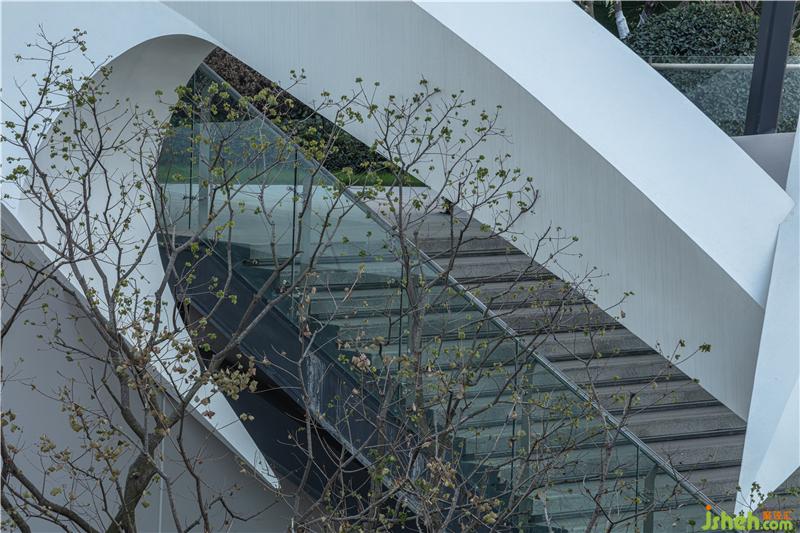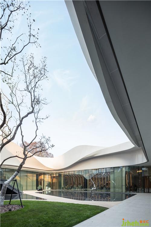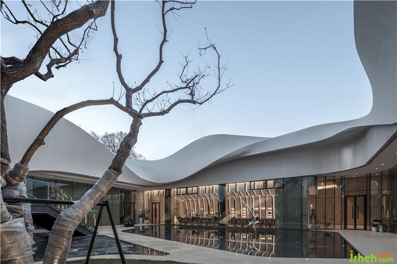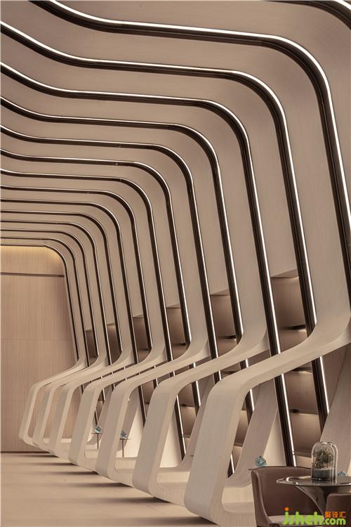簡潔的落地玻璃將自然光引入室內(nèi),并讓外部獨特的景觀與室內(nèi)空間產(chǎn)生對話關(guān)系,模糊了室內(nèi)外的界限南京售樓處設計。室內(nèi)曲線型的聯(lián)排光帶,將天花和墻面融合而成一整片光之幕墻,曲線造型增添了空間的活力和律動。