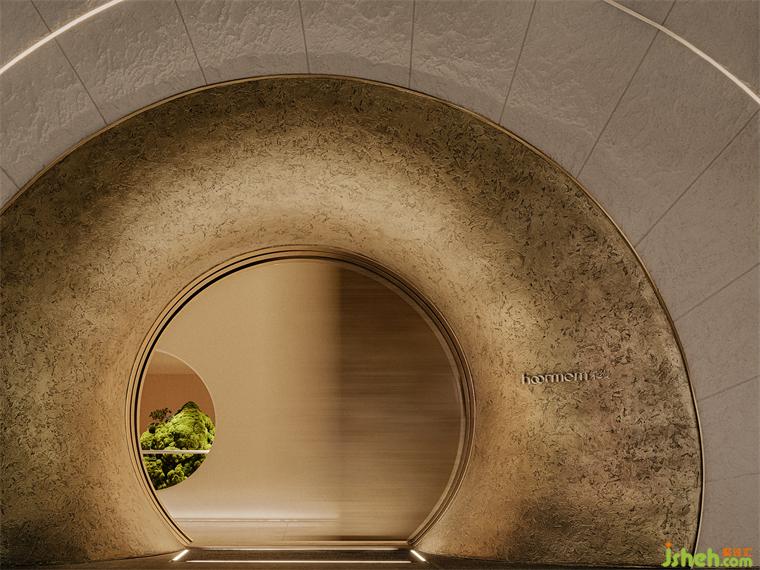 美學(xué)中心設(shè)計不同于其他大開大合的商業(yè)空間,這是一個幾乎密不透風(fēng)的空間外立面,大面積米白色肌理石貼面覆蓋著整面墻,以金色的金屬洞口為原點的墻面上的圓弧線,在增加外立面層次豐富度的同時,以一種更加柔和的方式指引著人們進入空間探尋。