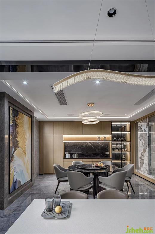 7米超大挑高沙發(fā)背景墻與電視背景墻對(duì)稱(chēng)布局,彰顯大宅恢宏氣韻。細(xì)節(jié)處設(shè)計(jì)師從自然山水文脈中吸取內(nèi)涵,創(chuàng)造現(xiàn)代藝術(shù)掛畫(huà),自然與藝術(shù)的巧妙結(jié)合,寫(xiě)意一方經(jīng)典,定制一座專(zhuān)屬于居者的品味空間。