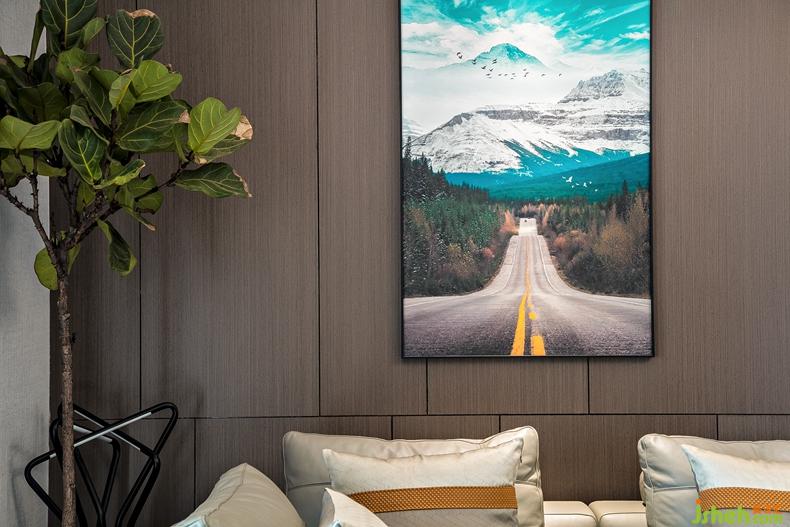 再者,室內(nèi)設(shè)計(jì)師考慮到客廳其實(shí)承載更多的是一個(gè)家的日常,同時(shí)匯聚著共同的生活目標(biāo)與每個(gè)家庭成員的生活軌跡,設(shè)計(jì)師選用了高級(jí)灰色調(diào)做底色鋪排平淡過渡,但細(xì)節(jié)處理畫龍點(diǎn)睛,描繪出業(yè)主一家對(duì)于未來生活的憧憬和探索冒險(xiǎn)主義精神,靈活生動(dòng)的渲染著空間氛圍,比如陳設(shè)掛畫上公路元素的黃色線條,與抱枕的有趣互動(dòng),讓藝術(shù)延伸到現(xiàn)實(shí),讓空間打破固有局限與思想的束縛。最美的風(fēng)景一直在路上~~~