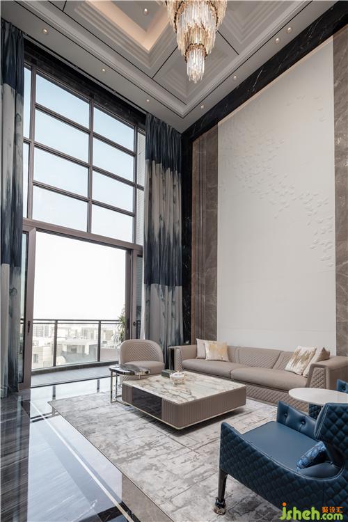 從玄關(guān)進(jìn)入挑高開闊的客廳,灰色大理石與水晶吊燈碰撞出的藝術(shù)張力,兼具秩序感與靈動(dòng)性,點(diǎn)綴天海般純凈的藍(lán)色,演繹出浩瀚蒼穹,這源于人們對(duì)于山巒、流水、叢林、天空天然的向往,它們一方面象征著自然力量,可以不斷滋養(yǎng)內(nèi)在精神,一方面溫潤柔軟,總能帶給生活許多靈感和滋養(yǎng)。