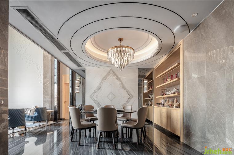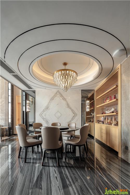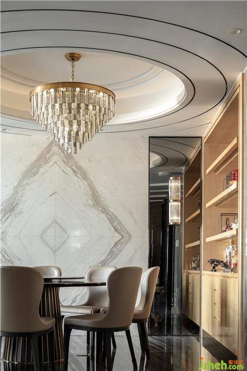 雅觀自在,貫穿整個餐廳的設(shè)計,可以看到傳統(tǒng)寓意“玉牌”造型水晶吊燈將平安如意的福愿,轉(zhuǎn)化為層層水波造型吊頂,隨漣漪蕩漾開讓喜樂充盈整個家,與根繁葉茂的美好寓意相映成趣,滋養(yǎng)身心。