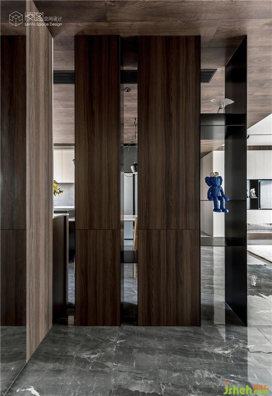 入戶處原有的一面實(shí)墻,被具有鞋帽柜功能的隔斷所取代。