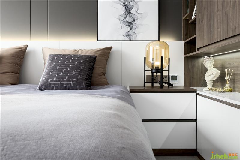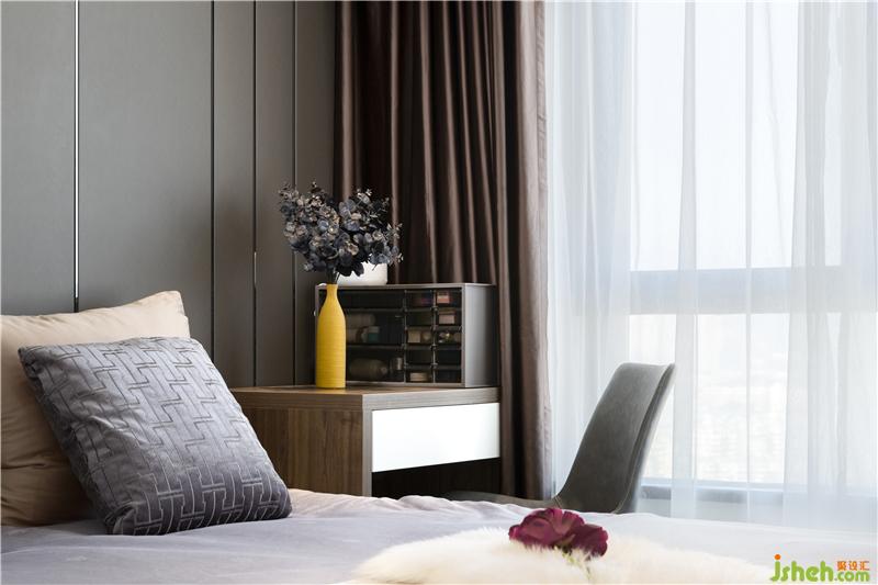 PS:本案整木整體定制無靠背帶儲藏功能床鋪、撞色梳妝臺、床頭柜及書桌、整體隱形拉手、外蓋柜門及抽屜,有效提升整體感。裝修公司