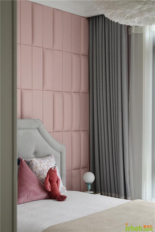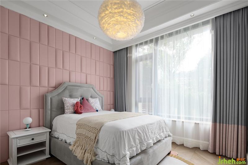 粉色馬卡龍主題的臥室,凹凸變化的背景搭配粉色窗簾的細(xì)節(jié),輕盈的羽毛燈更增添少女的浪漫情懷;