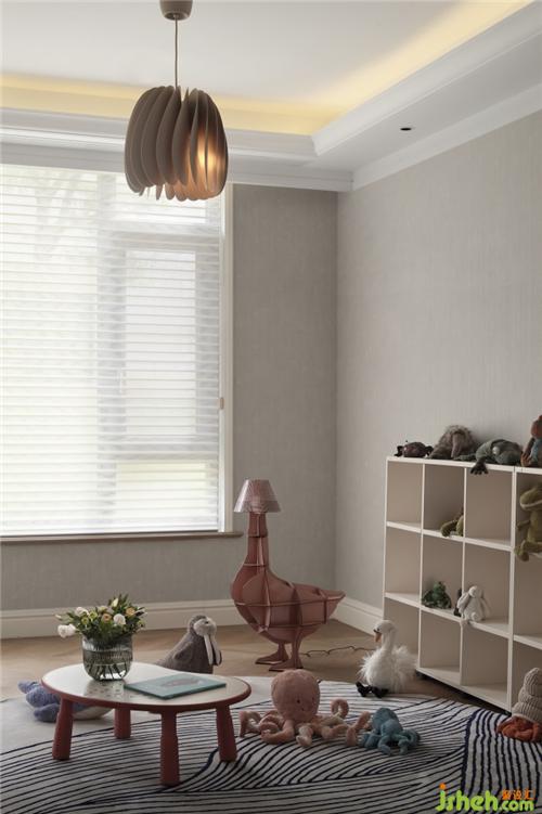孩子玩耍的空間,這里沒(méi)有固定家具也沒(méi)有電視機(jī),只有墻面收納柜,專(zhuān)門(mén)用來(lái)放置孩子的玩具;