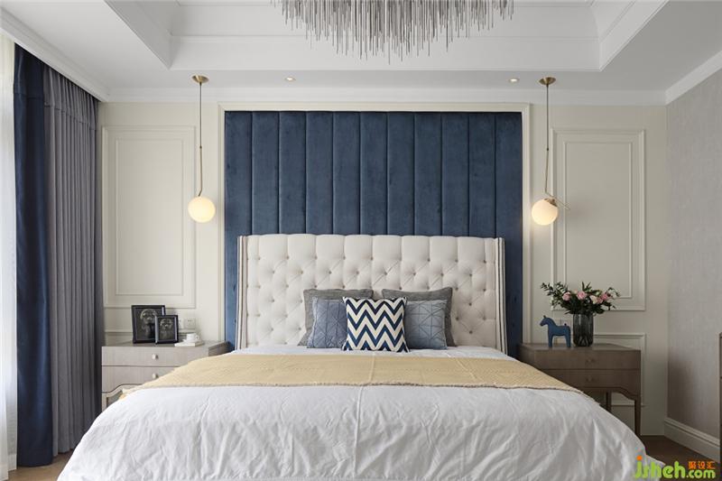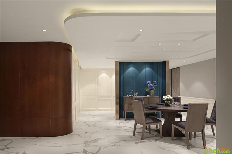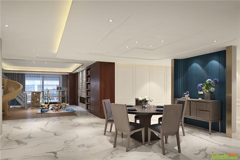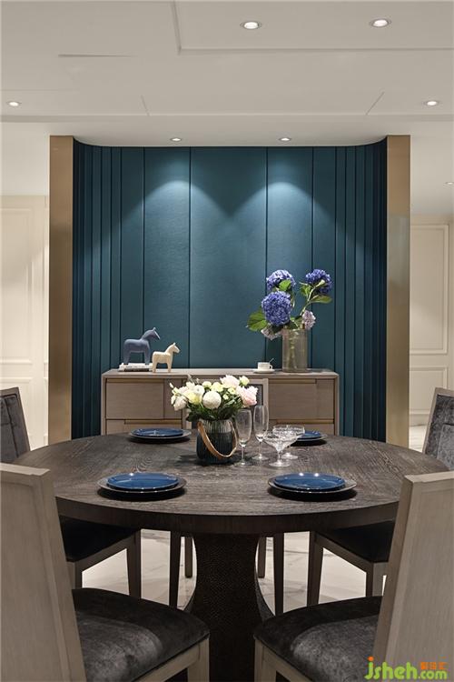 餐廳頂較低,下層的樓板給設(shè)計帶來難題,索性將低就低,適當(dāng)優(yōu)化,做成被按彈的琴鍵,別墅裝飾裝上點光源,解決樓層的低矮,給空間帶來更多律動;靚藍(lán)色背景居中作為餐廳背景,分隔空間;
