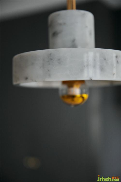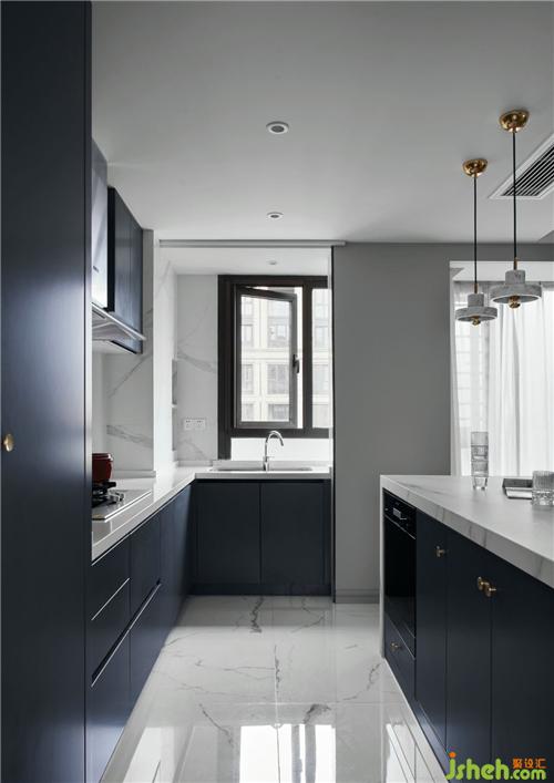 廚房深灰藍(lán)的櫥柜與墻壁上花白大理石鋪陳交匯出冷調(diào)的內(nèi)斂矜持又不失高雅的氛圍,餐桌上的水晶玻璃吊燈,溫潤(rùn)精致,充滿了藝術(shù)美。
