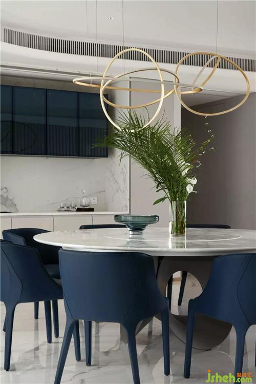 客餐廳通透的空間使光線互相穿插交匯,開敞而明亮,各種美食可以在中西廚肆意調(diào)配,于精美的Arketipo大理石圓桌上,四時三餐,一家人盡享親昵時光。