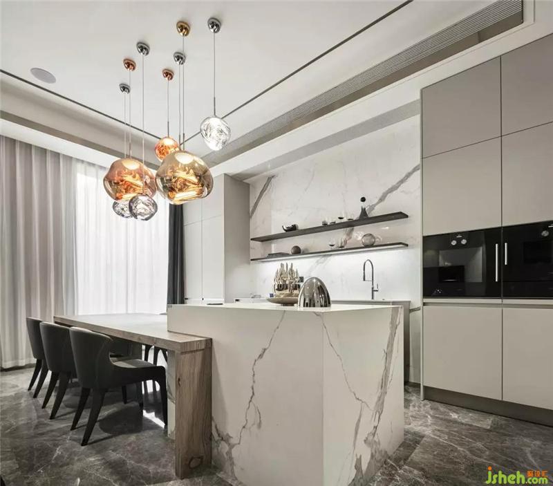 這套面積接近六百方的別墅,業(yè)主在跟設計師溝通的時候,提出一個需求要增加空間的互動感,所以別墅裝飾設計師打破了原有的餐廳結(jié)構,設計了一個社交廚房,增強客餐廳的交互性。