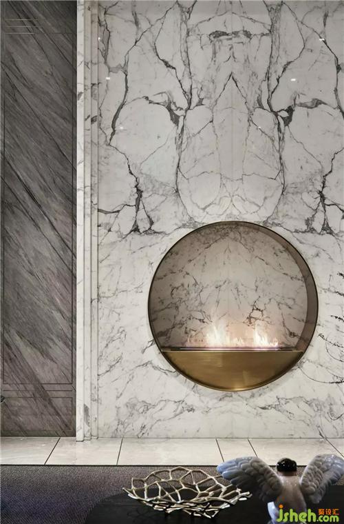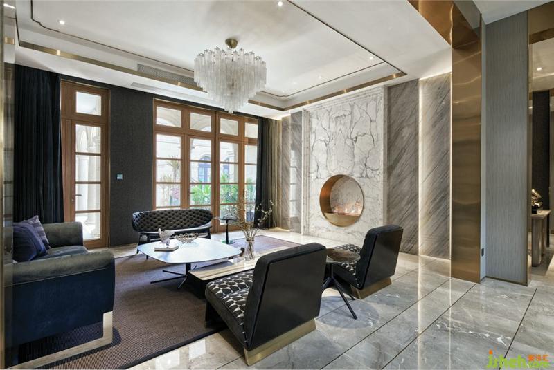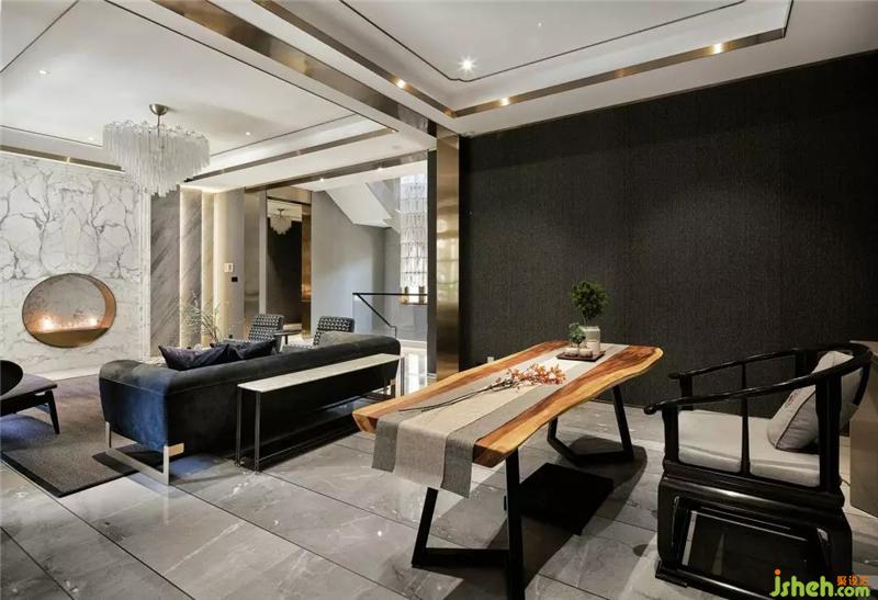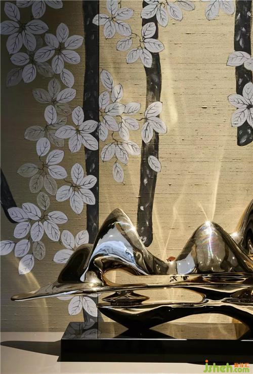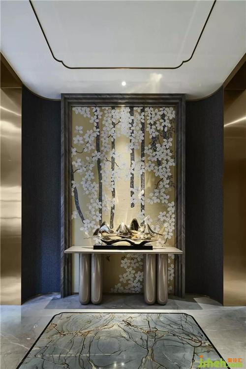 在這個(gè)遠(yuǎn)離塵囂的法式合院里,更是于繁華都市中獨(dú)享一片寧靜,推開家門,撲面而來的繁花背景搭配金屬材質(zhì)的端景臺(tái),豐富的材質(zhì)與色彩變化,增添雅奢趣味,方正開闊的空間,避免繁雜線條與多余家具,當(dāng)居住者身處其中,亦能感受到空間開揚(yáng)洗煉、明亮采光縈繞。