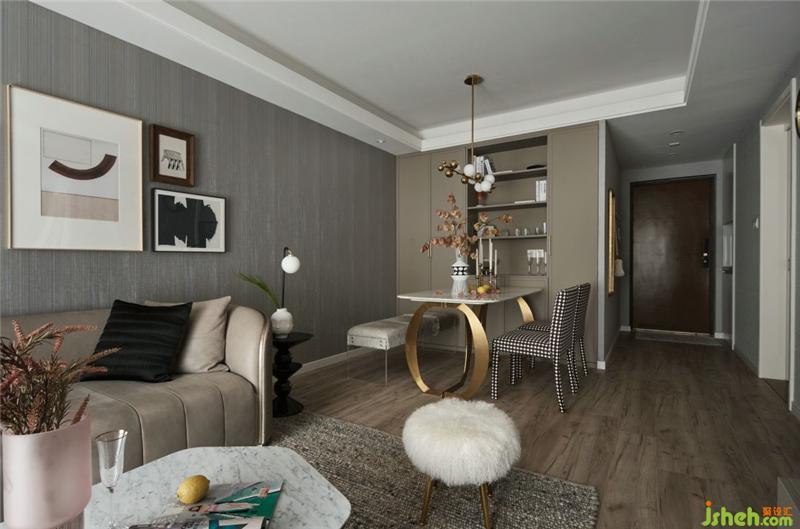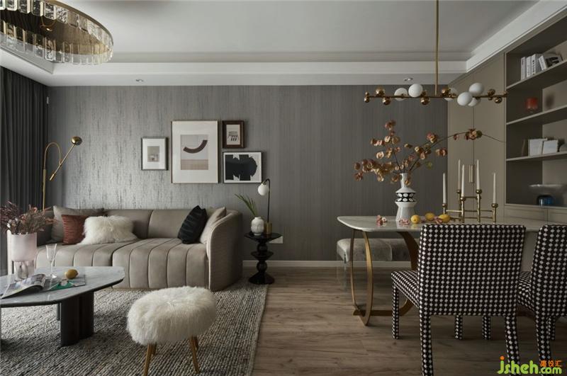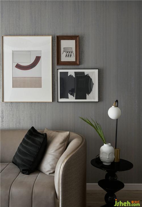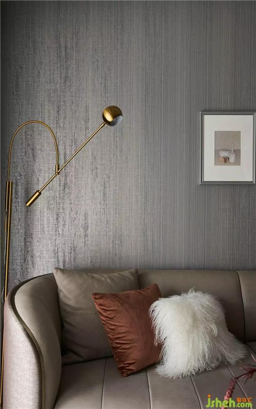 色彩在空間里面起到非常重要的作用,深淺灰的合理使用可大大提高空間視覺感,墻紙的肌理和乳膠漆形成鮮明的對比,奶咖色家具和局部黑色飾品的點(diǎn)綴,豐富了整個(gè)空間的層次,金屬質(zhì)感的配飾又增加了時(shí)尚輕奢的效果。