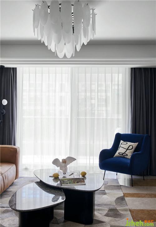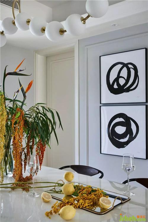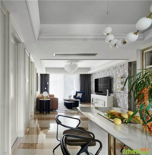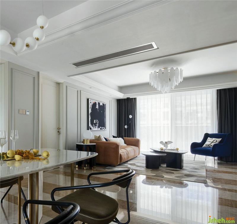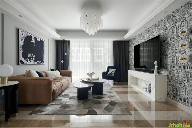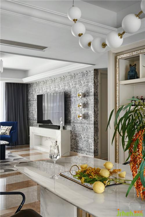 原始的屋況,樣板房的氣息非常濃郁,我們?cè)诳刂聘脑斐杀镜耐瑫r(shí),最大化的利用軟裝去改變他固有的風(fēng)貌,首先以充滿時(shí)尚藝術(shù)感的壁紙取代原有墻面復(fù)雜造型,杭州裝修設(shè)計(jì)沙發(fā)背景以簡(jiǎn)單線條分區(qū),硬裝色彩呈現(xiàn)黑白灰的色塊,棕色皮質(zhì)沙發(fā)呼應(yīng)原始地面石材,墨藍(lán)色的單椅跳動(dòng)空間氛圍,再搭配精選的配飾、燈具讓整個(gè)空間充滿了現(xiàn)代時(shí)尚感。