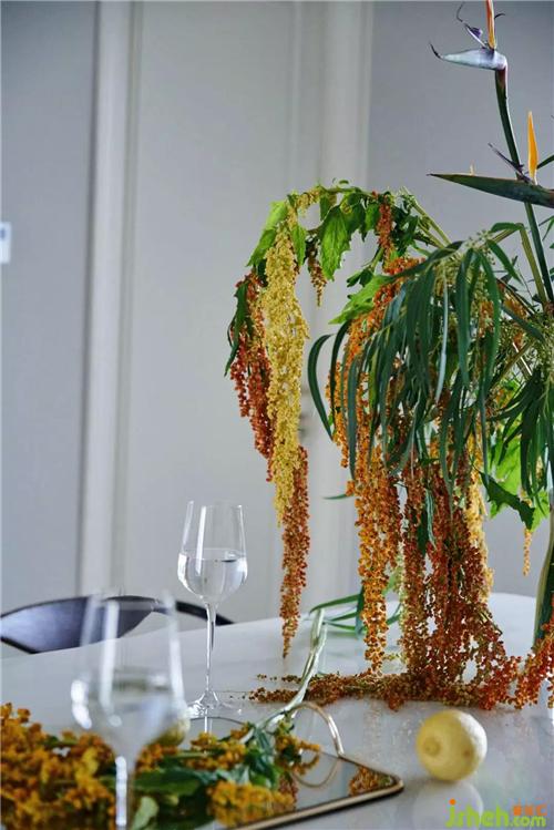 餐廳在保留原功能柜的同時(shí),依然延續(xù)客廳的設(shè)計(jì),從色彩到配飾整體調(diào)整氛圍,白色圓球球項(xiàng)鏈燈個(gè)性而獨(dú)特,搭配餐桌上春華秋實(shí)的花藝,一派豐收的景象。