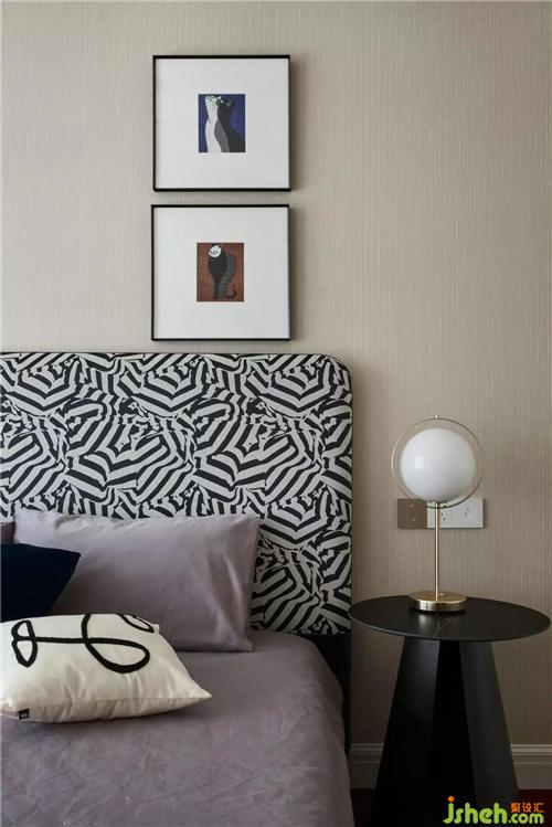 次臥室黑色紋路的床背,充滿(mǎn)個(gè)性時(shí)尚感,裝飾畫(huà)的重疊豎排和動(dòng)物變形的圖案,無(wú)形增加了空間的趣味性,金屬球形燈更是在空間起到點(diǎn)睛的作用。