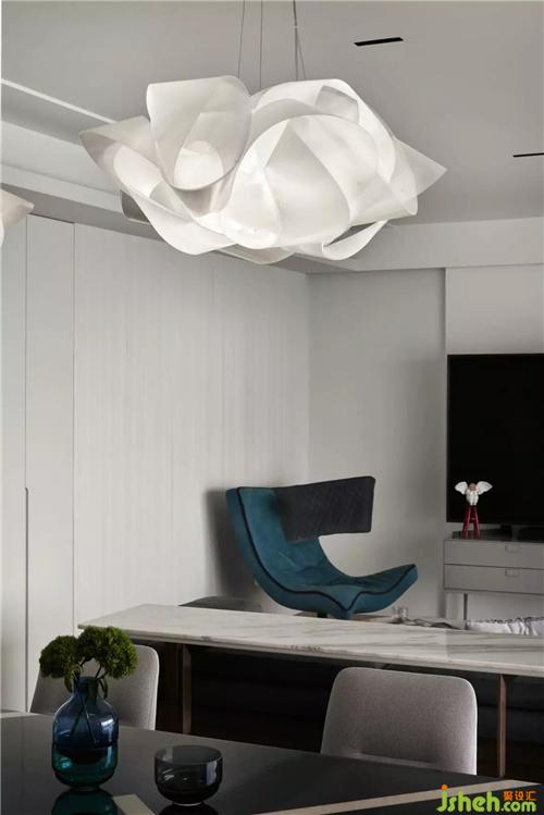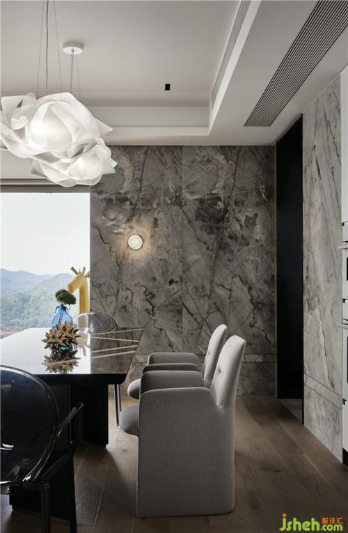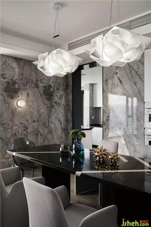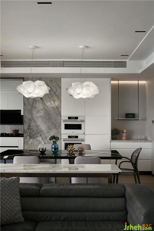 客廳餐廳連接式的布局是提高空間利用率的好方法,黑色巖板餐桌在灰色大理石墻面的映襯下,顯得華麗又質感,白色調的西廚劃分合理,繁多的雜物都可以收納妥當杭州裝修公司。