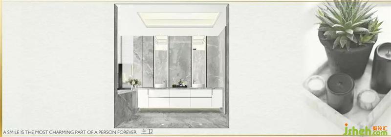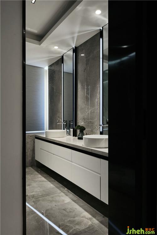 雙人位的洗手臺(tái)面干凈利落,在灰色大理石的映襯下,富有層次和變化。