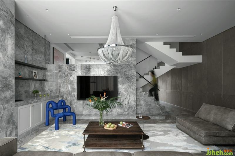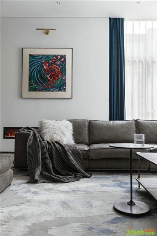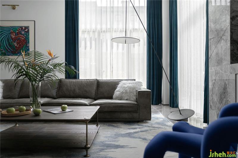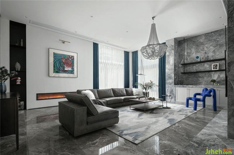 客廳雙朝向的落地窗,使空間在不同的時(shí)間段內(nèi)都光線充足,沐浴陽光之下,一杯茶水、一本書可以坐享一天的悠閑時(shí)光。在灰色大理石和白色墻面的基調(diào)里,窗簾與裝飾畫的湖藍(lán)色點(diǎn)綴其中,既中和了空間的溫度又構(gòu)造了美好生活的音律。