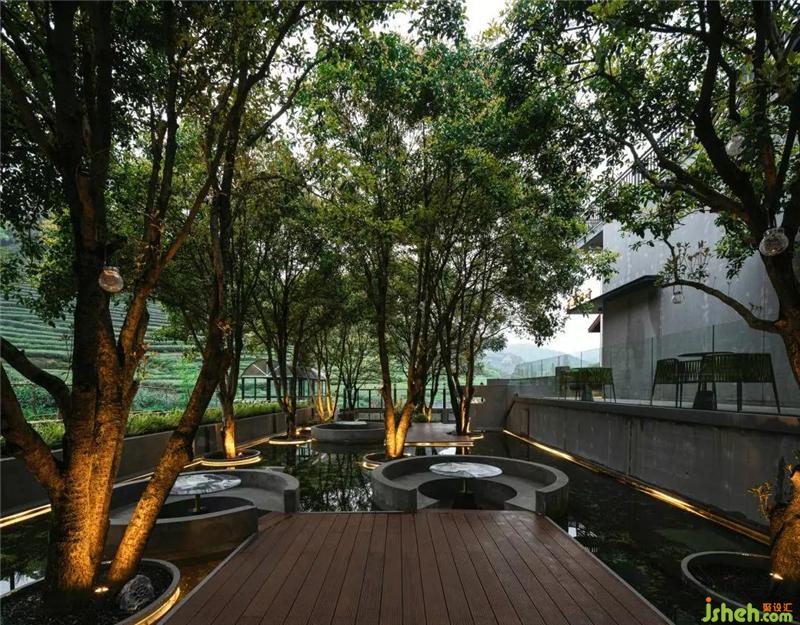 走進院落,杭州會所設計下沉式的卡座恍如水中碗蓮,陽光透過樹枝的縫隙灑下來,光影斑駁,坐下來沉浸于周圍茶香清幽之中,一板木,一縷光,足以讓心境沉淀,讓靈魂駐足。