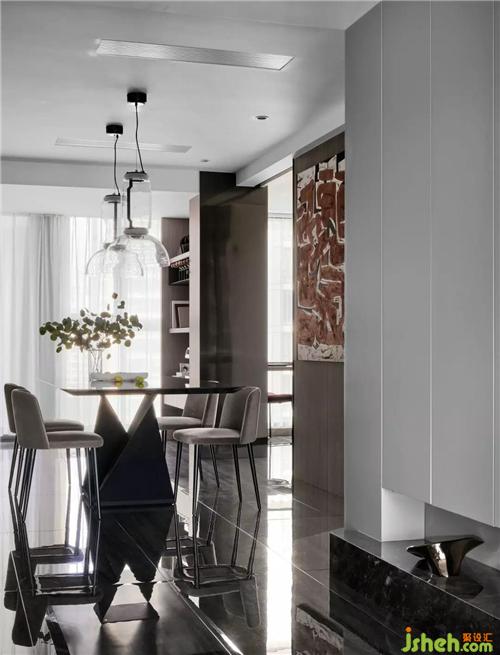 改造后的餐廳空間規(guī)整,南北互通的陽(yáng)光和米色墻面使空間柔和有加,水晶玻璃的餐吊燈和走心的小配飾寓意了主人的美好生活,墻面的抽象裝飾畫(huà),更增添了空間的趣味性。