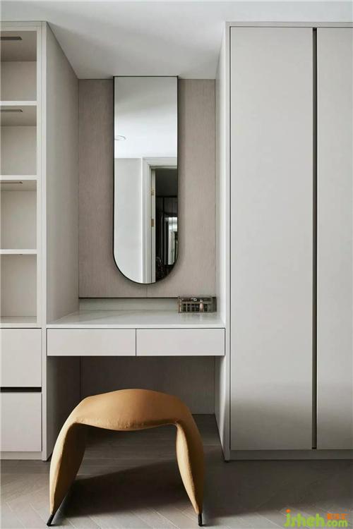 次臥室內(nèi)空間的處理,以深厚的墻紙、暖色的家具為主要,整體保持沉穩(wěn)的中性色調(diào),以更好地與外面的空間相互呼應。