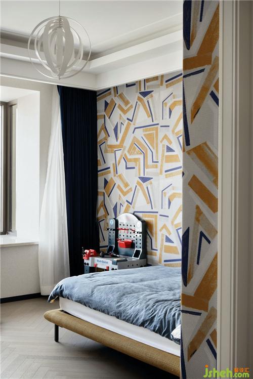 設(shè)計師根據(jù)原有戶型的結(jié)構(gòu),把主臥與兒童房中間留出的區(qū)域做成兒童玩耍區(qū),兩個重要的空間之間有了連接;兒童房內(nèi)用了很大膽的墻紙,在自由與清爽的家中給予了生氣勃勃的氣息;