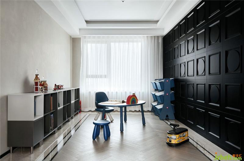 兒童房外側(cè)使用了專門定制的黑色護墻,一方面增加了空間的層次和質(zhì)感,另一方面是要與入戶玄關(guān)鞋柜后墻,兩面整合在一起上海室內(nèi)設(shè)計師。