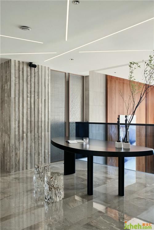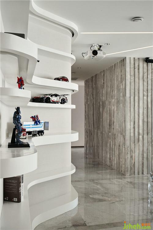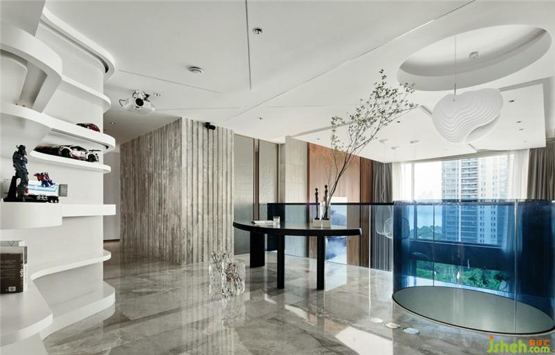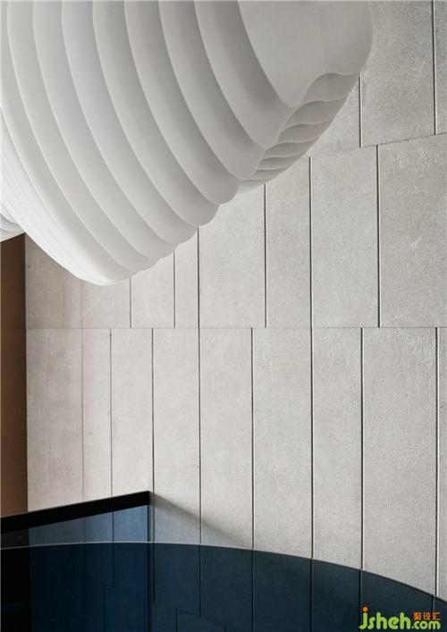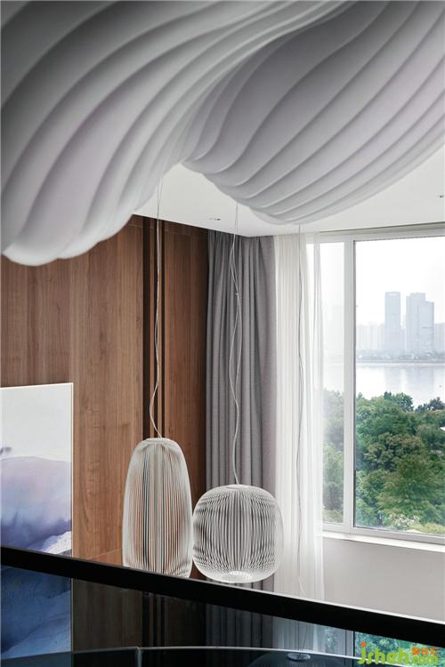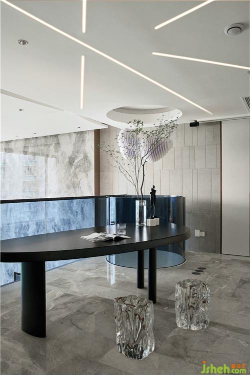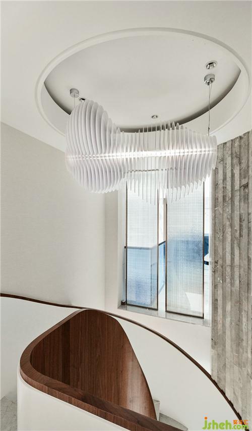 二樓家庭廳在天井位置增加了藍(lán)色玻璃,圓形吊頂與天井大小相同,加上不規(guī)則吊燈,光束映照到一樓玄關(guān)位置,仿佛是一件藝術(shù)裝置;藝術(shù)是對(duì)一件事、一個(gè)物品乃至一個(gè)念想賦予外界的認(rèn)知和自我認(rèn)知融合在一起產(chǎn)生的精神祈求。