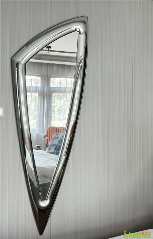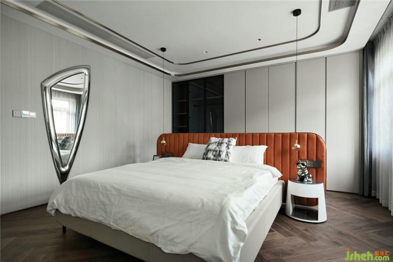 女兒房主色調為橘色,墻面上使用凹凸感很強的墻紙,搭配上cattelan italia的不規(guī)則鏡子;床背景設計現(xiàn)場制作的弧形與軟包搭配,考慮到原始戶型結構為長方形,則把化妝臺設置到床背景后,呈現(xiàn)出整個女兒房簡單而奢華的情調。