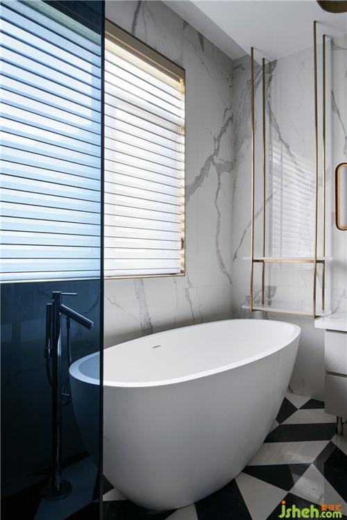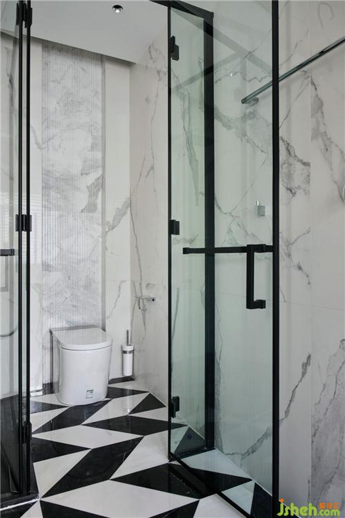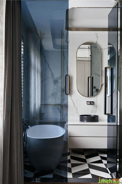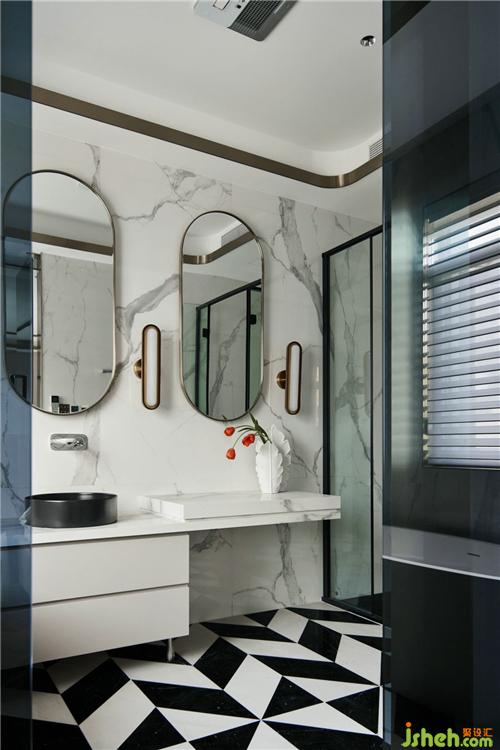 女兒房衛(wèi)生間使用黑白拼接地磚與白色紋理墻磚搭配,通過黑與白的相互交錯,杭州別墅裝飾可以打造出一種無限延伸的空間感;