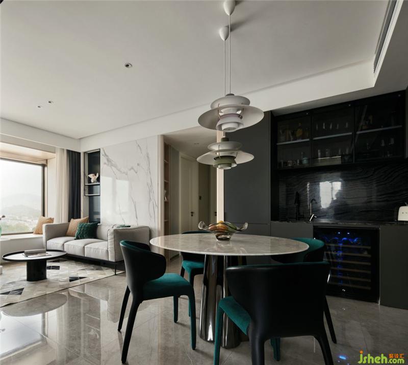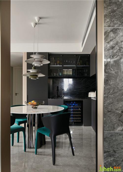 餐廳與客廳處于同一空間,兩者之前的聯(lián)系密不可分,沙發(fā)背景使用了白色大理石,則餐廳制作純黑的櫥柜。杭州裝修設計麻雀雖小五臟俱全,根據(jù)業(yè)主需求,紅酒柜、水吧臺、展示柜等都保留好位置。