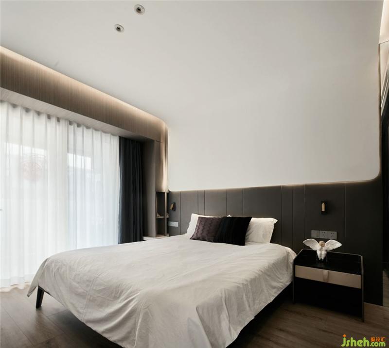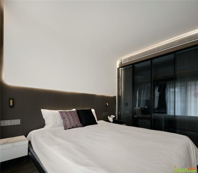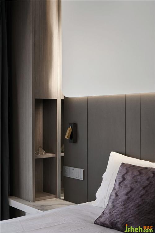 主臥吊頂拋開了常規(guī)做法,做了一個異形延伸到墻面,成為了整個屋子的亮點。設計師根據(jù)原始戶型為主臥留出一個衣帽間的位置,衣帽間墻體另一側作為走廊上的儲物空間,物盡其用便是如此吧。