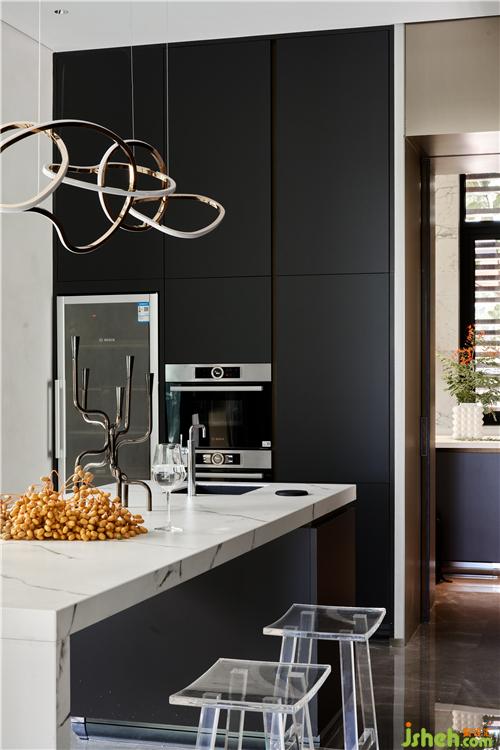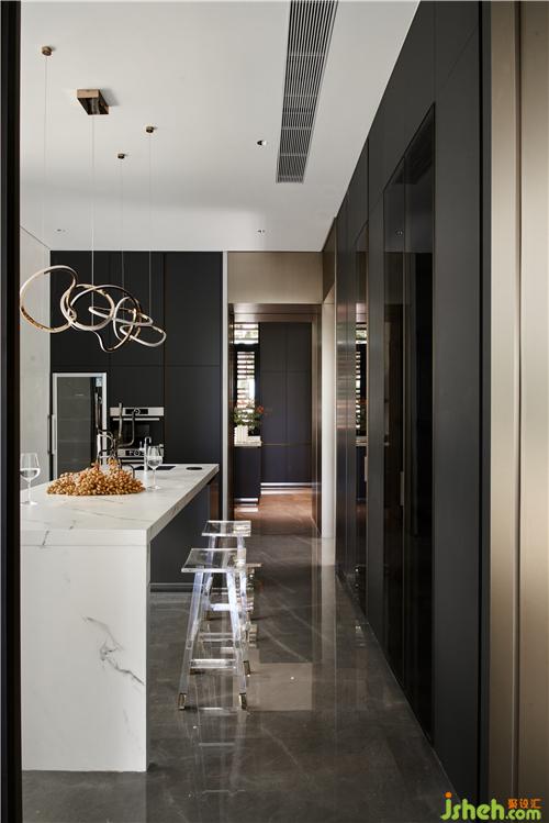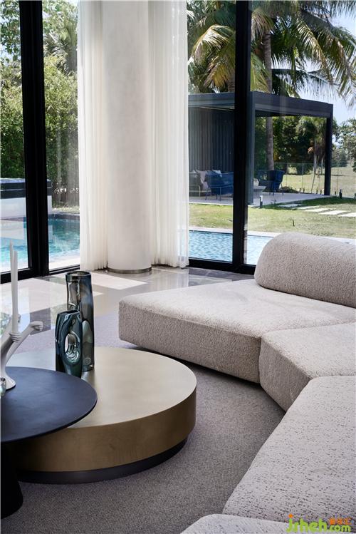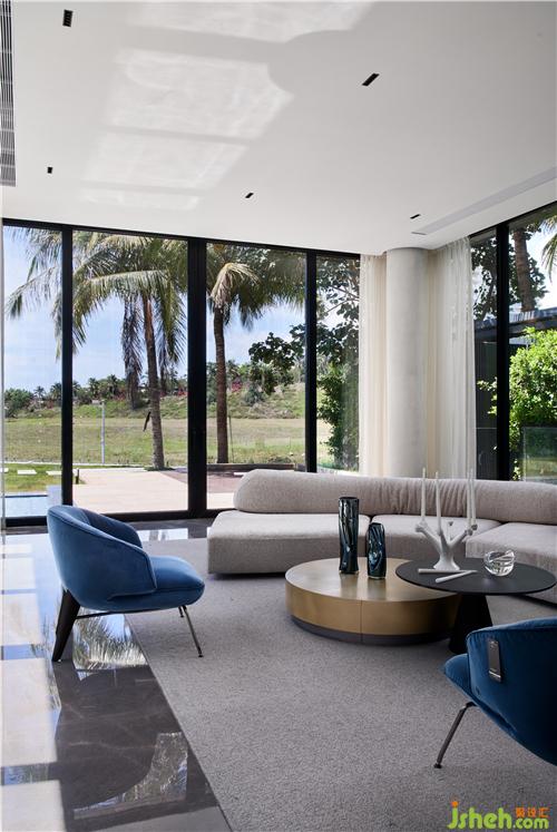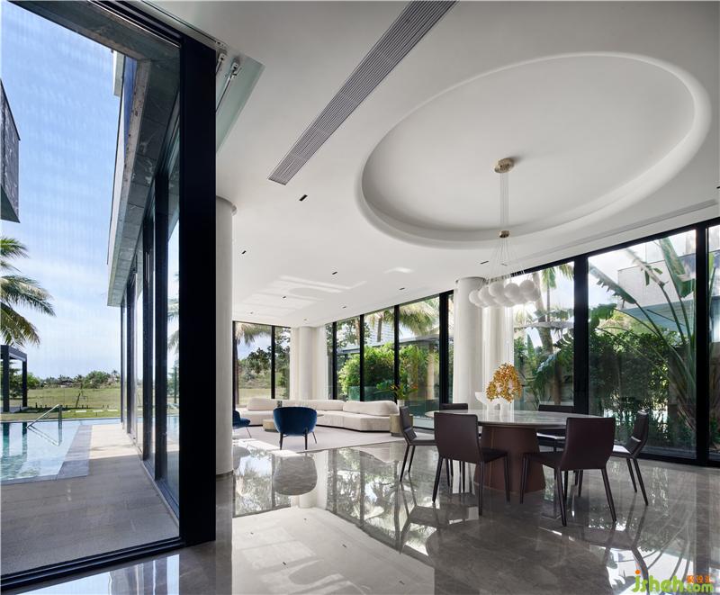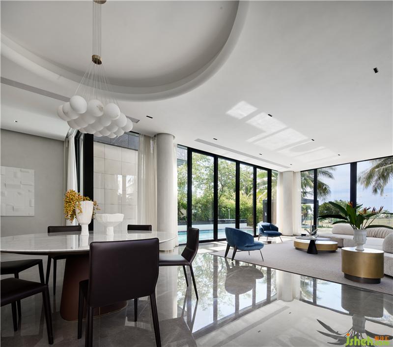 設計的意義不在意事物,而在于氛圍和感官。落地窗外有泳池、花草樹木藍天,三亞別墅裝飾客餐廳剛好利用這天然美景,室內(nèi)不添加冗余的設計,走既簡單又高級路線,設計線條十分流暢。