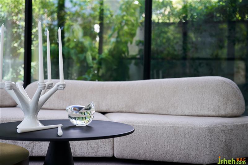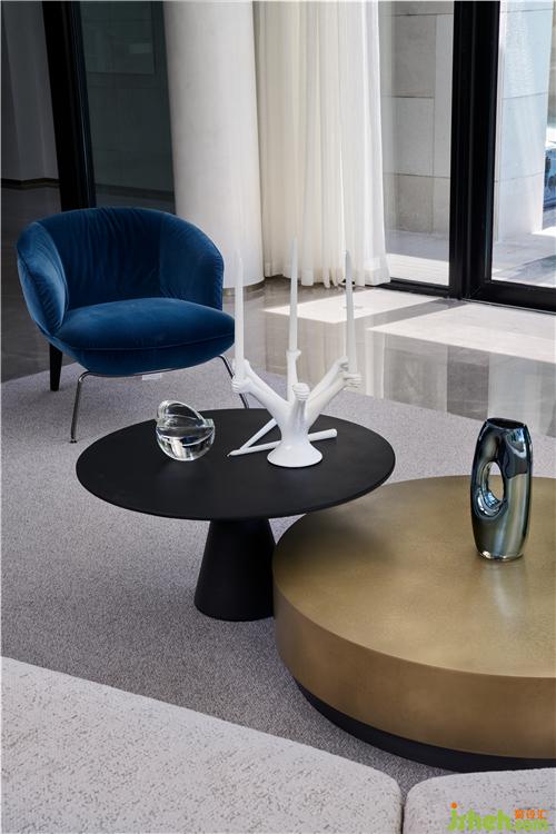 軟裝搭配需要別出一致,不超過自然美景但同時也要與之配合。藍色單人沙發(fā)與窗外的藍天池水對應,作為空間跳色不單調(diào)且高級,茶幾金屬質(zhì)感,沙發(fā)布藝質(zhì)感、擺件玻璃質(zhì)感等共同組合,為這一個空間的增添亮點。