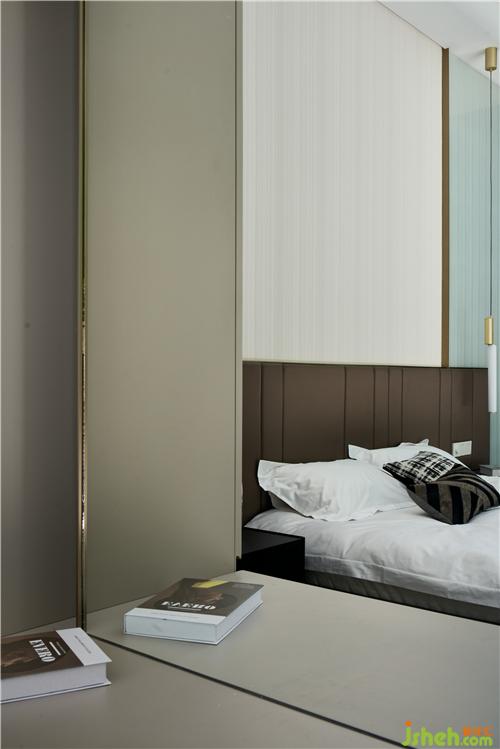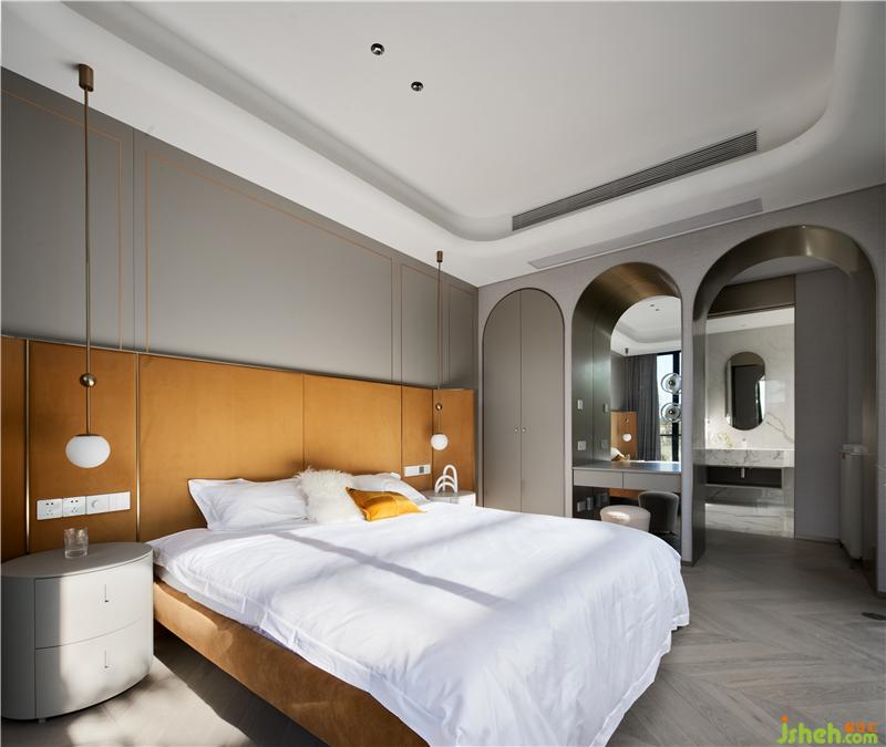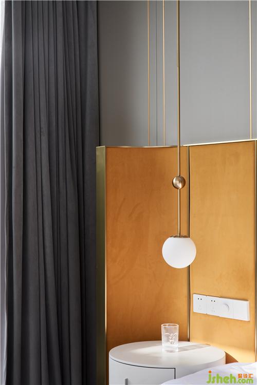 次臥主要打造一個相對活力的臥室,所以使用鮮艷的橙色作為主色調(diào),現(xiàn)場制作的硬包與床架選用同一布藝材質(zhì),金屬作為點綴;單人沙發(fā)散發(fā)著優(yōu)雅華貴的氣息,邊幾非常有特色,是兩只手掌組合的形狀。