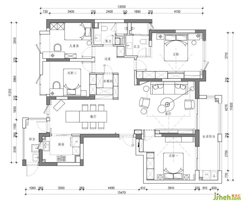 關(guān)于規(guī)劃:設(shè)計(jì)師在一番拆改之后,客餐廳視覺空間擴(kuò)大,并且變得整齊開敞,可以滿足孩子們?cè)谑覂?nèi)奔走玩鬧;休息區(qū)過道調(diào)整之后,杭州裝修設(shè)計(jì)去往各個(gè)房間的動(dòng)線也清晰起來,互不干擾;共用衣帽間大大增加了家庭的儲(chǔ)物功能,同時(shí)衣帽間位置的調(diào)整,使入戶也變得通透爽朗。