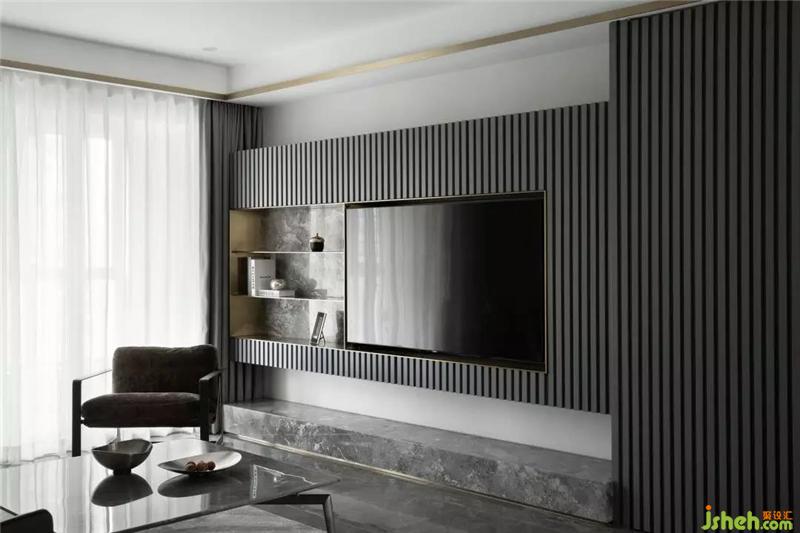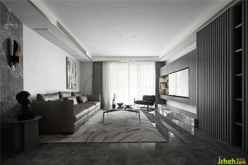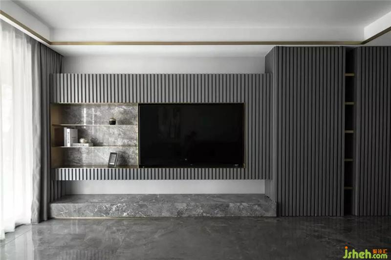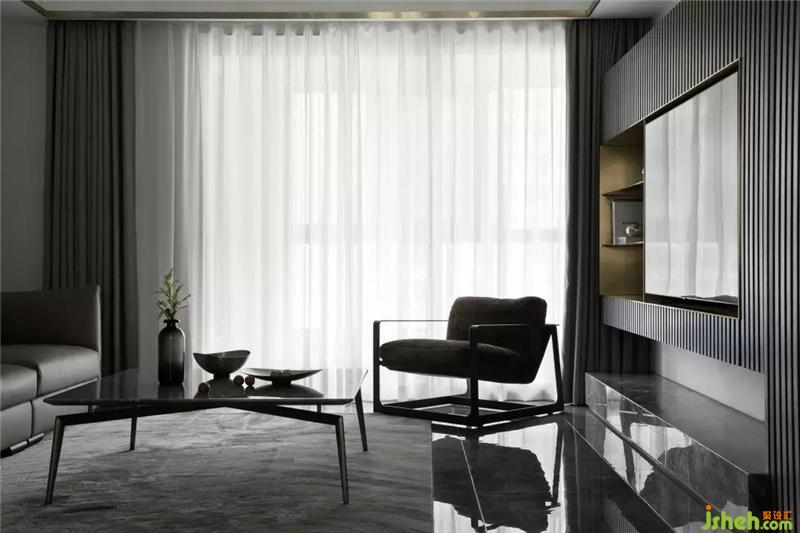 全空間以灰白色調(diào)為主,電視墻隱形柜門的格柵線條,滿足功能同時(shí)豐富了空間的層次感;沙發(fā)背后灰紋路的大理石裝飾和金屬板的運(yùn)用,杭州裝修設(shè)計(jì)營造出一種有機(jī)的現(xiàn)代奢華感,用線條勾勒出一個(gè)干凈簡(jiǎn)單的畫面。