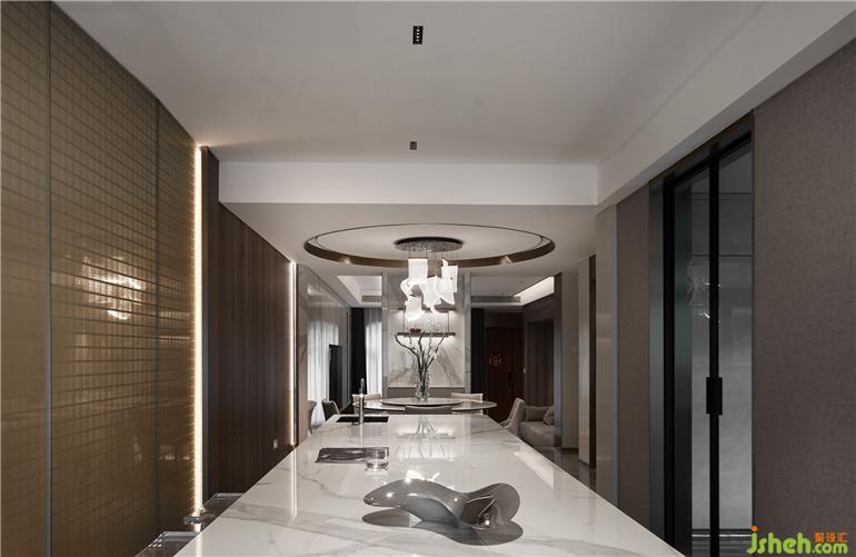 西餐島臺內(nèi)部內(nèi)嵌式的蒸箱、烤箱很大程度的釋放了空間。別墅設(shè)計視覺上的簡約流暢促進(jìn)著家人之間親切的交談,消除房屋格局帶來的距離感。