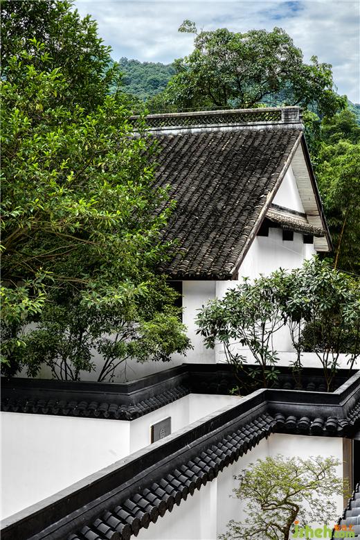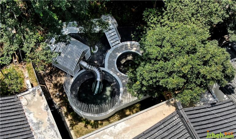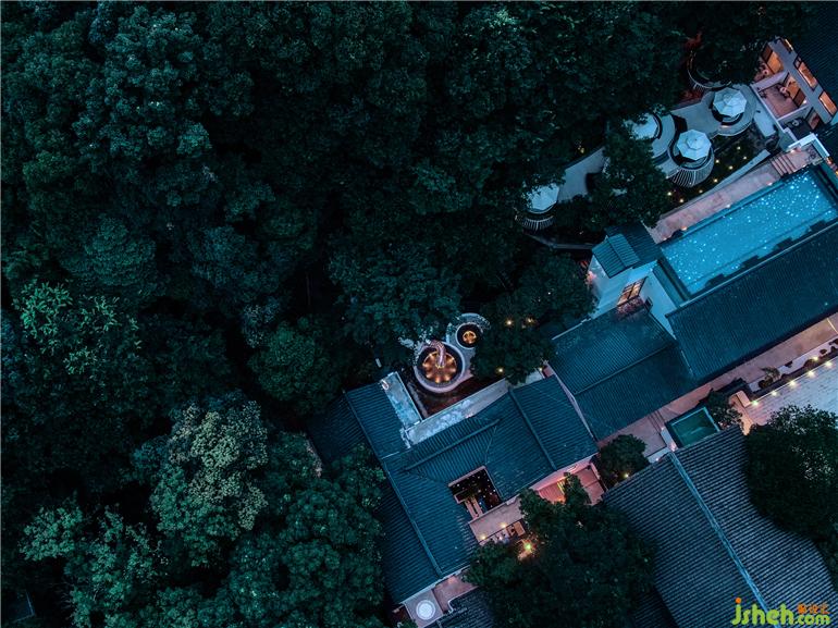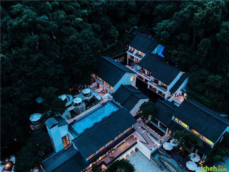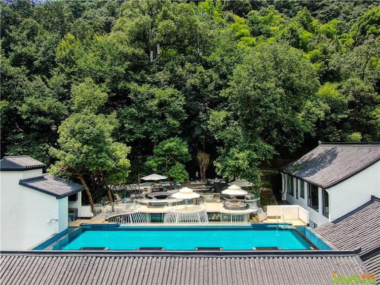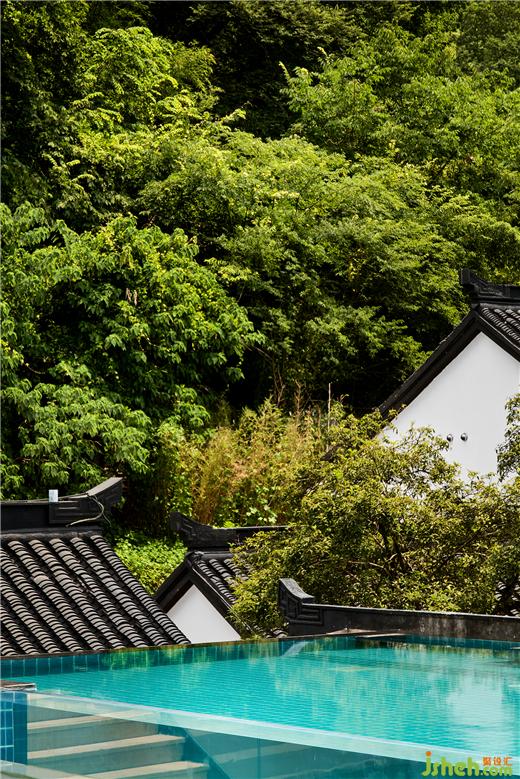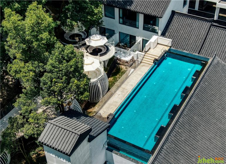 徽派建筑屋頂呈現(xiàn)全景觀泳池,傳統(tǒng)東方美學(xué)與新時代生活理念碰撞出奇特而美妙的火花。古韻極致,白墻黛瓦,錯落有致。一汪蔚藍色泳池與天空相呼應(yīng),掩映在漫山遍野的綠色中,是現(xiàn)代建筑與自然的完美交融。