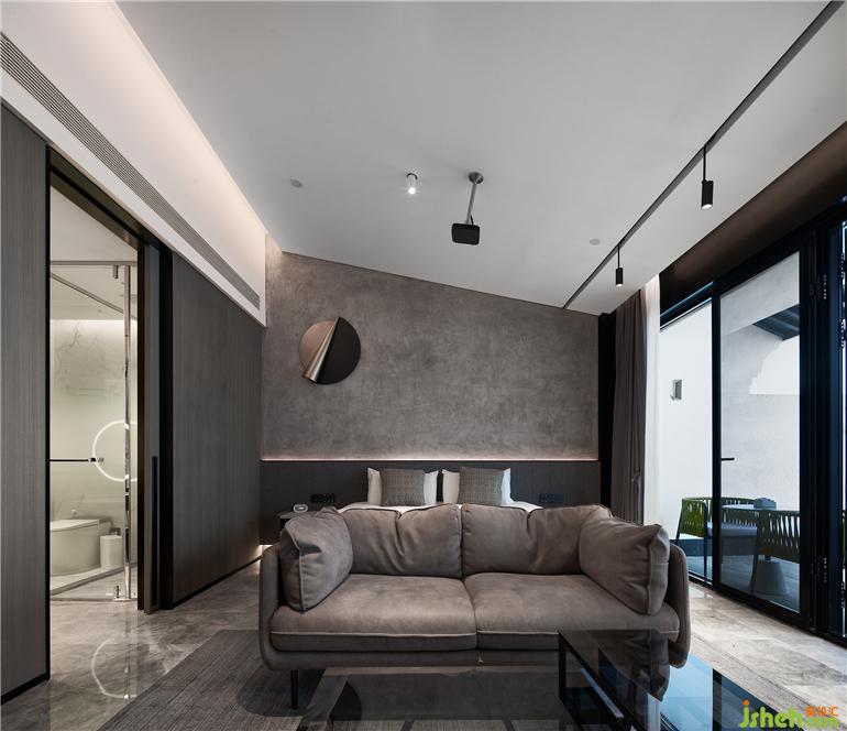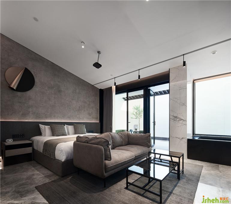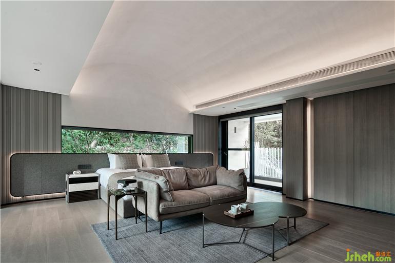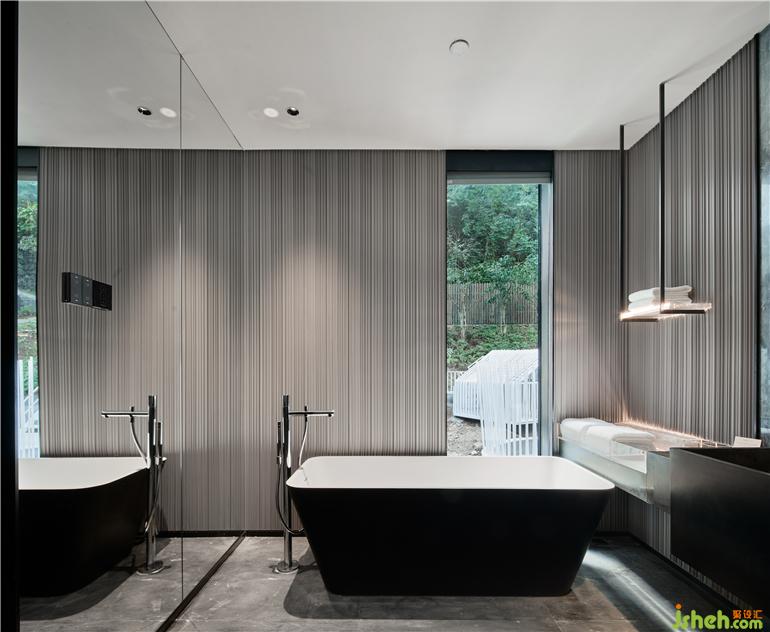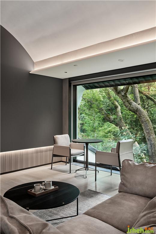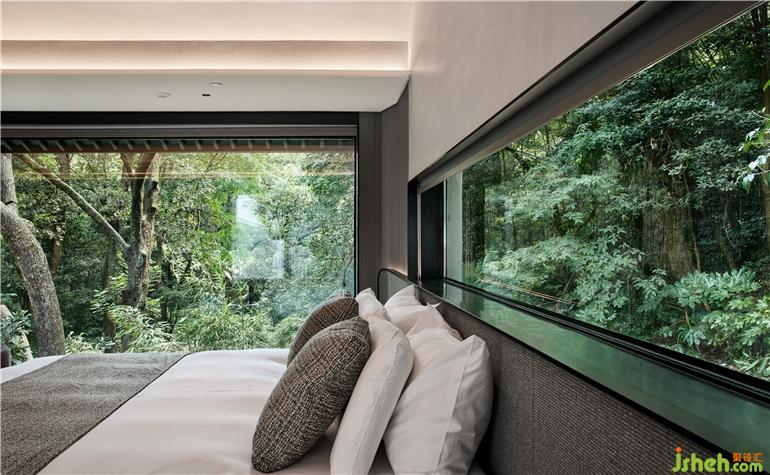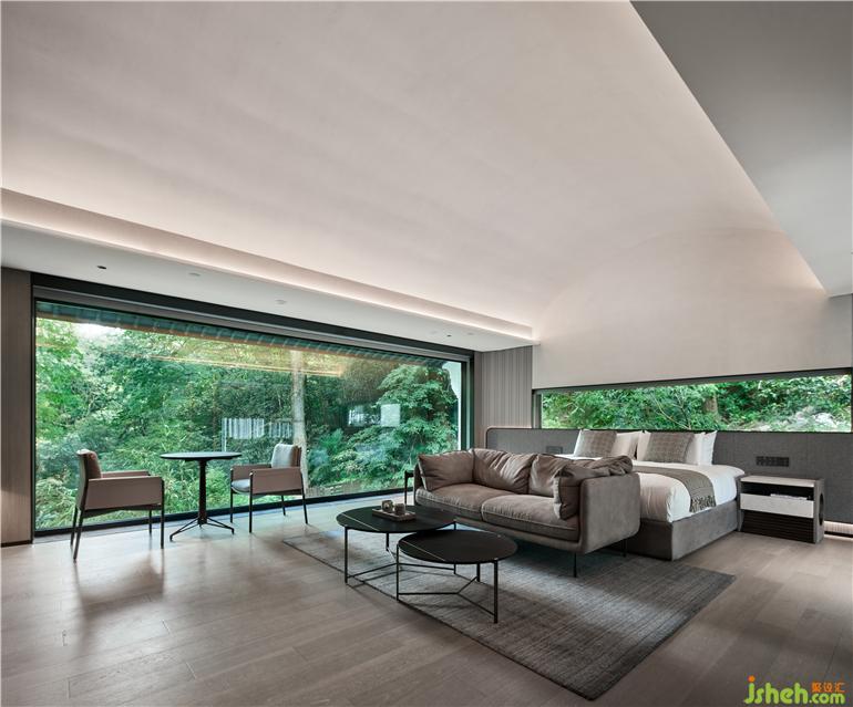 杭州度假酒店設計兩面通透的落地玻璃窗,把山林綠意帶來眼前。
