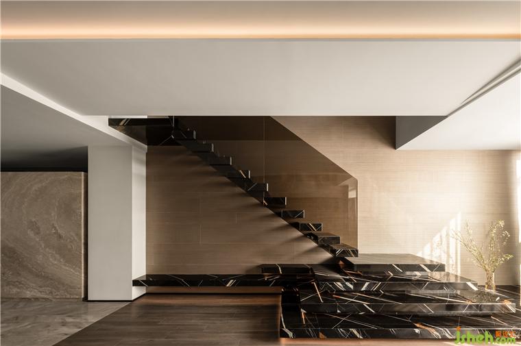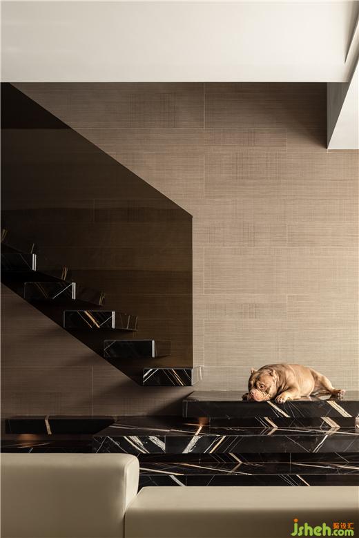 定制鋼架樓梯經(jīng)過反復(fù)驗證確保其安全性;面對頂樓散落的陽光,勞倫黑金色石材帶來的質(zhì)感搭配歐茶色玻璃扶手,整座樓梯呈現(xiàn)出如藝術(shù)裝置一般的觀賞性。兼顧使用與美感。