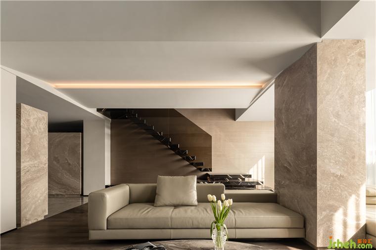 出于育兒、養(yǎng)寵家庭的考慮,我們在客廳特別選用皮質(zhì)沙發(fā)與木地板;杭州綠地華家池印裝修設(shè)計整面通高的落地窗景充分引入自然光線與視野,而整體素雅的米白中性色基調(diào)更加凸顯懸浮樓梯的存在感。