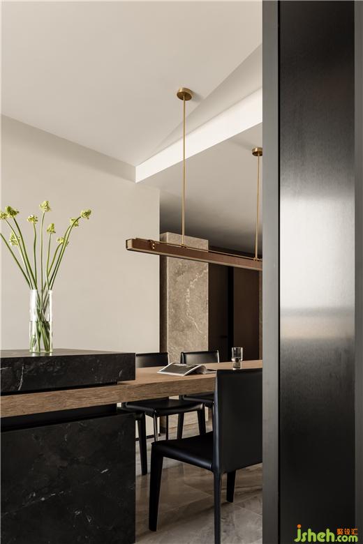 功能上,中餐廚房+西餐島臺(tái)的設(shè)計(jì)平衡居住年齡差異與飲食多樣化的的差異。而形式上的疊級(jí)、嵌入、解構(gòu)又為平凡的生活建立優(yōu)美的秩序與幾何美感。