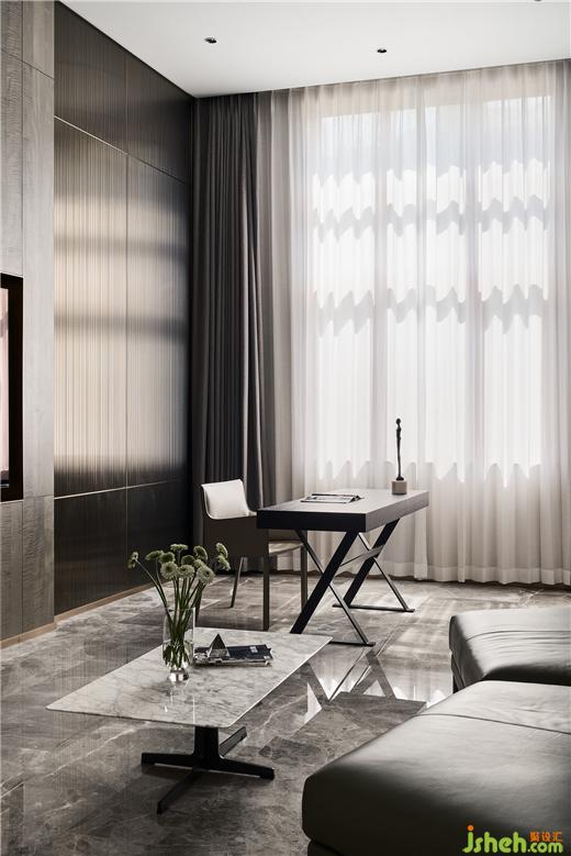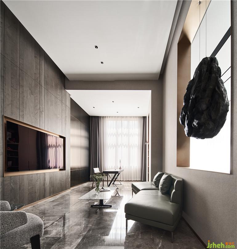 這種類似“取景”的手法創(chuàng)造出可對(duì)話交流的視線,呼應(yīng)的金屬“畫框”則成為了引導(dǎo)視線的線索?!吧绞睉业踉诋嬁蛑虚g,杭州綠野春天別墅裝飾設(shè)計(jì)形成一部分的視覺遮擋,讓窗開出更大氣,也更親人的尺度。