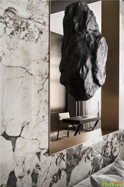 來自潘多拉的奢石色彩將共享、開放的客廳與相對(duì)隱秘的工作區(qū)隔開,背景墻面的“開窗”又使得空間彼此聯(lián)系。