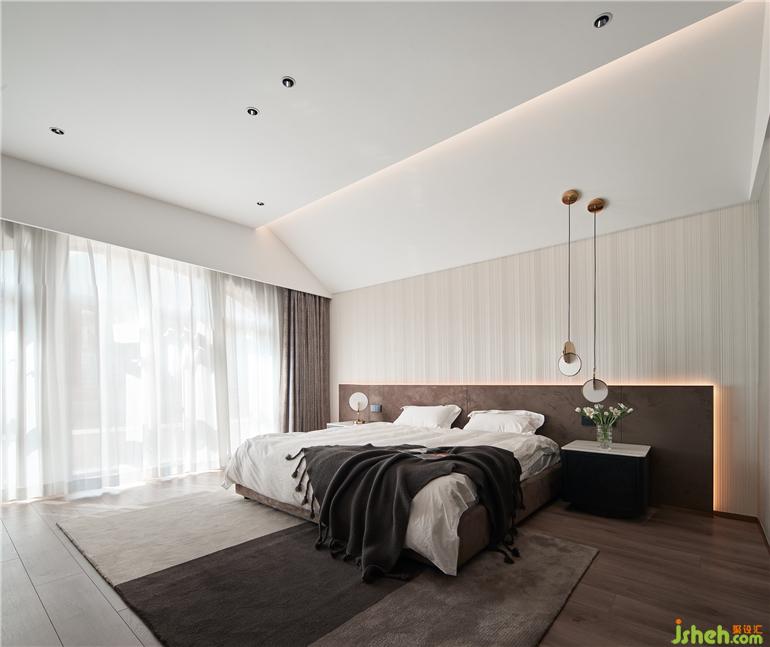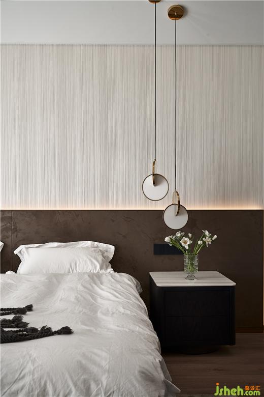 主臥自帶步入式衣帽間與休閑露臺(tái),傾斜的頂面原始結(jié)構(gòu)采用疊級(jí)處理,經(jīng)典VESCOM壁紙獨(dú)有的長(zhǎng)條肌理為為簡(jiǎn)奢的空間營(yíng)造立體感。