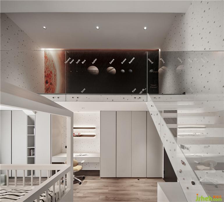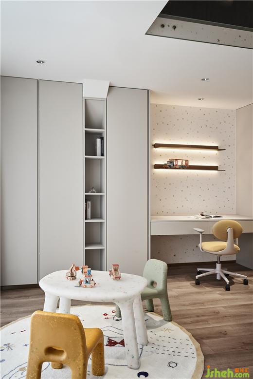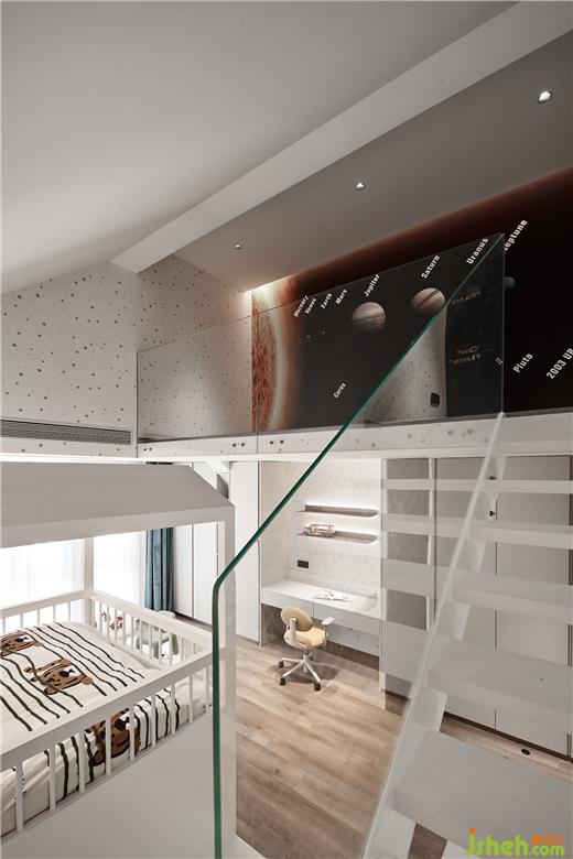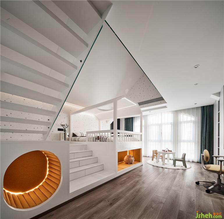為兩個(gè)活潑可愛的孩子定制的互動(dòng)空間,杭州綠野春天別墅裝飾設(shè)計(jì)利用建筑中的坡頂創(chuàng)造出類似閣樓的復(fù)式結(jié)構(gòu),供孩子們自由的躲藏、攀爬、玩耍,伴隨他們一路學(xué)習(xí)成長(zhǎng),度過幸福的童年生活。